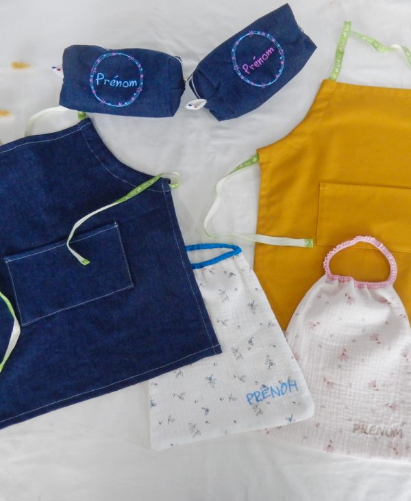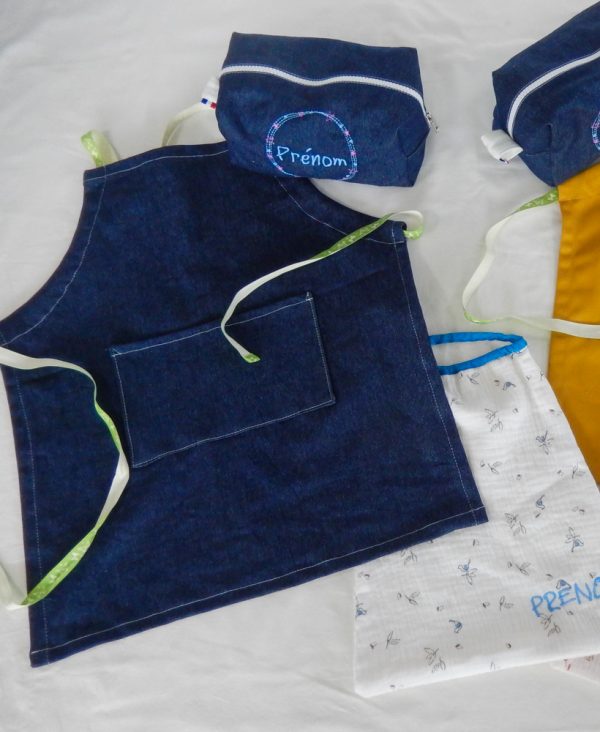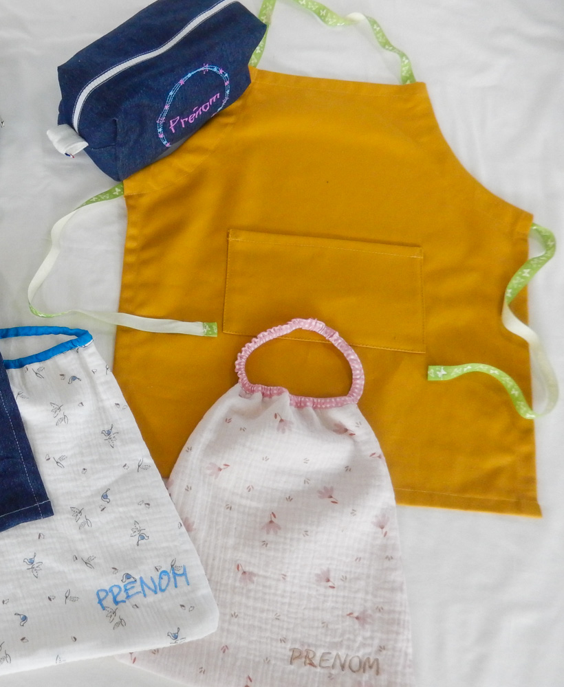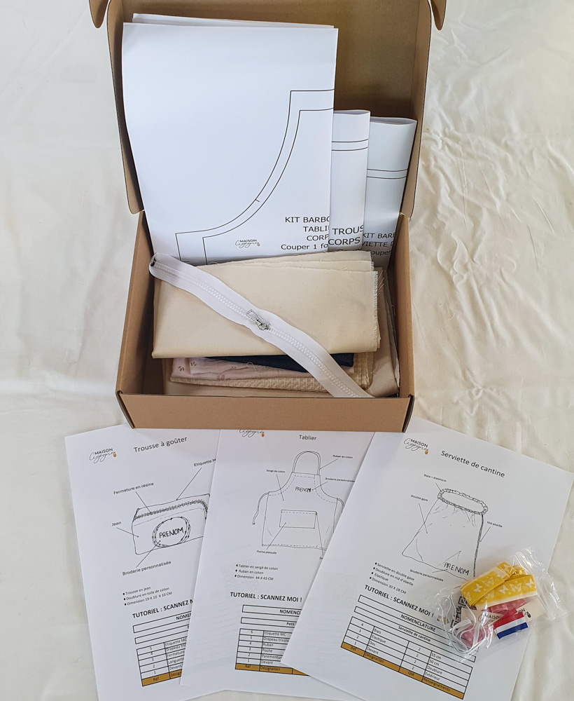 Cette box couture 3 en 1 vous permet de réaliser un joli ensemble d’accessoires scolaires faits main : un tablier, une serviette de cantine et une trousse à goûter assortis.