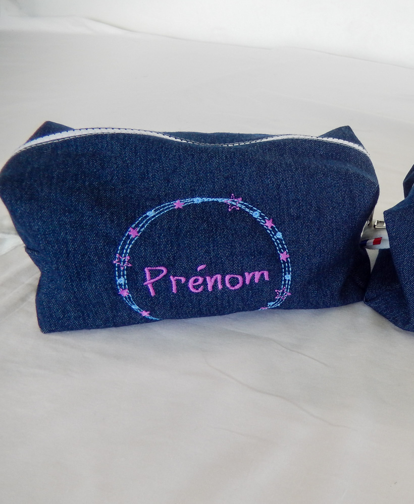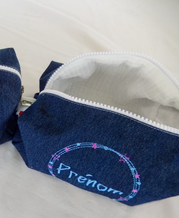 • Forme rectangulaire avec un zip, doublée avec de la double gaze, en jean de qualité,