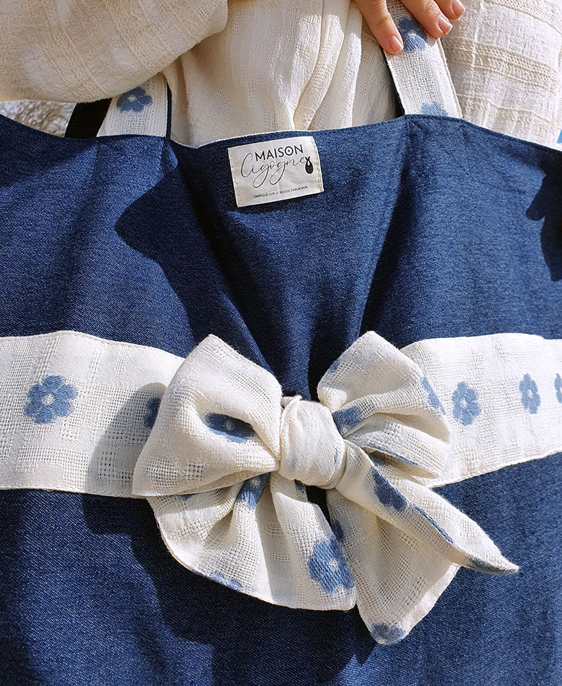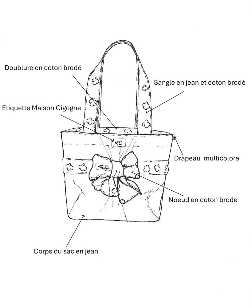 Cette box vous permet de confectionner un sac cabas robuste et raffiné grâce au mariage du jean upcyclé et d’un gros nœud en coton brodé, pour une touche sophistiquée.