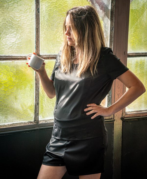 Vous n’aimez pas coudre ? Retrouvez notre pyjama Pyla prêt à porter, en version classique ou allaitement ! En satin élasthanne issu de stocks dormants de maison de haute couture française, il est composé d’un short fluide et d’une blouse élégante. Ce modèle en satin élasthanne haute couture allie douceur, brillance et liberté de mouvement.