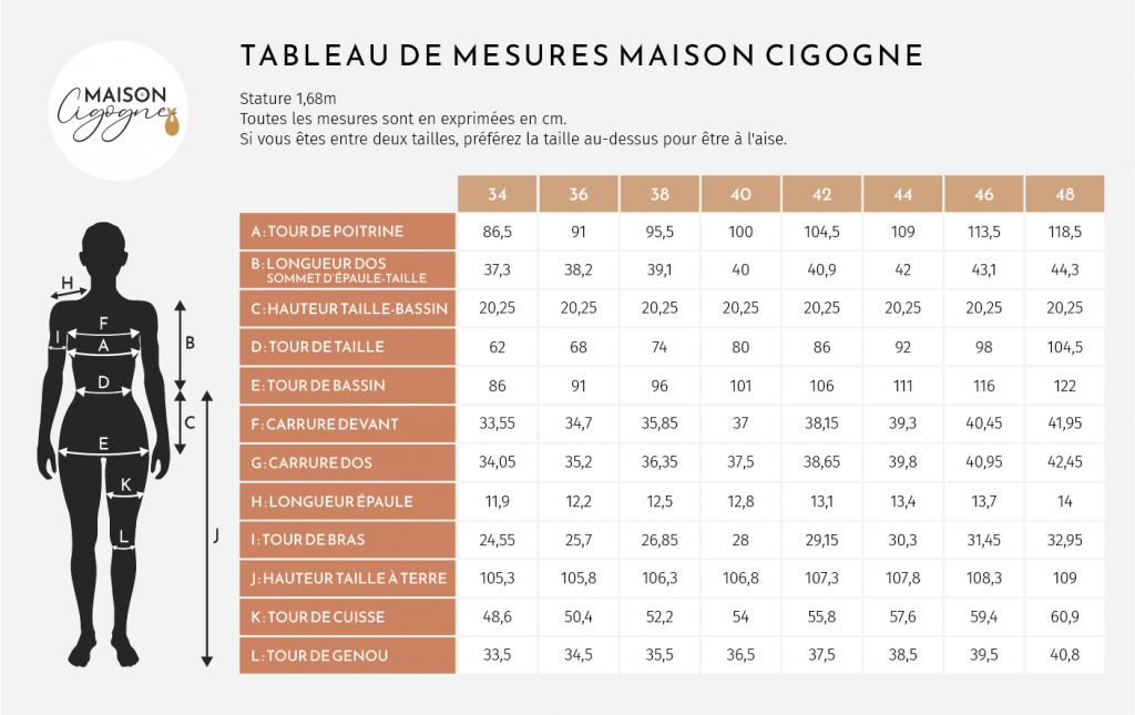 Stature 1,68m. Toutes les mesures sont exprimées en cm. Si vous êtes entre deux tailles, préférez la taille au-dessus pour être à l’aise.